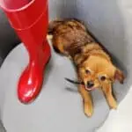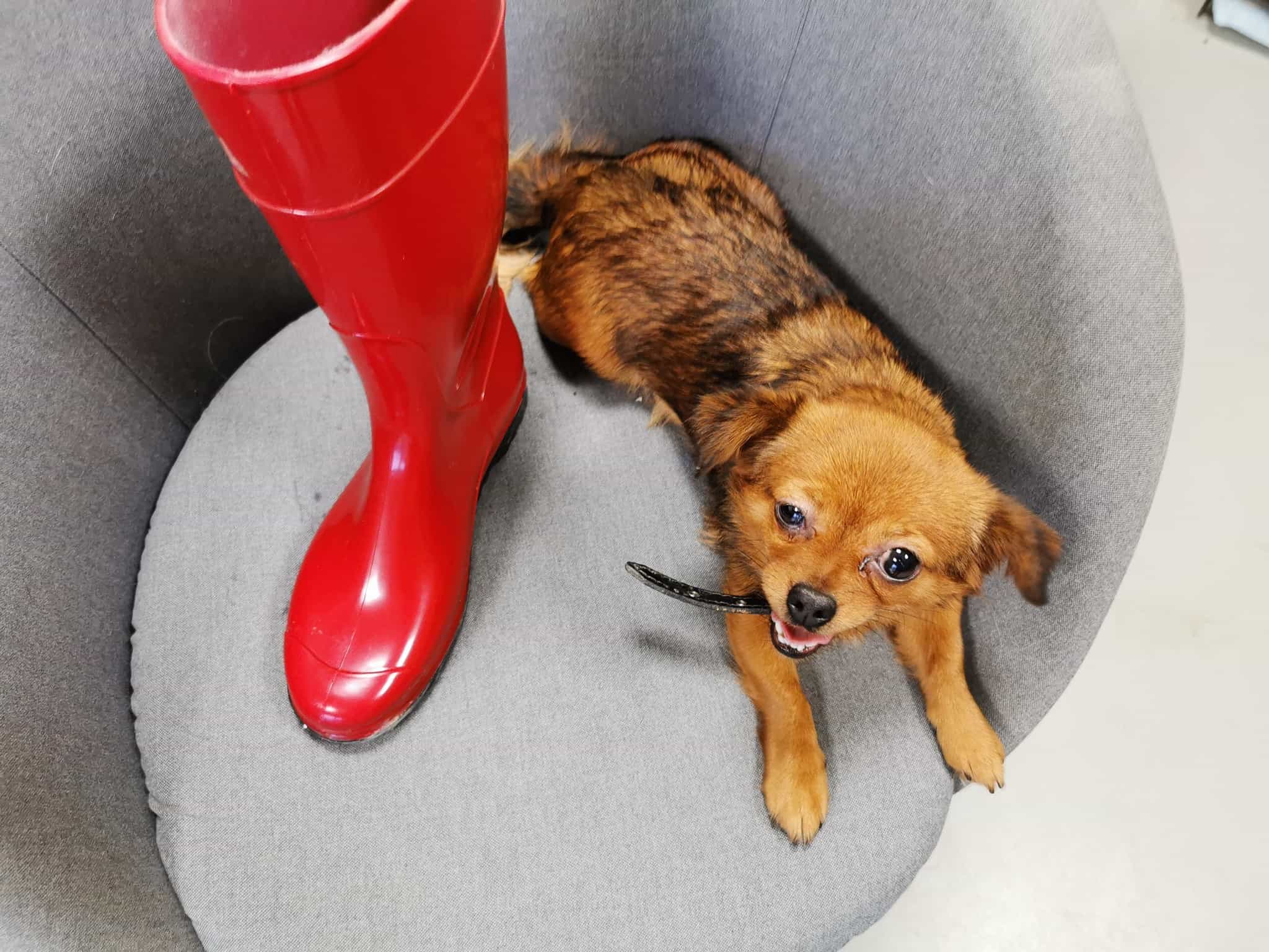 Minut on laitettu näissä kuvissa kokoa 38 olevan punaisen kumisaappaan viereen. Aika hassua, eikös vain? Näin on yritetty näyttää, että olen ihan oikeasti minimini XXS kokoa oleva koira.
