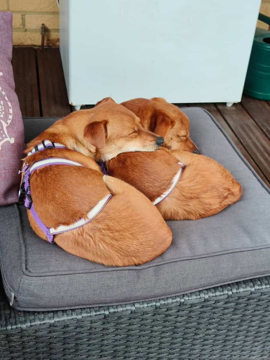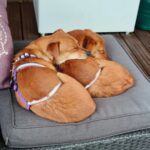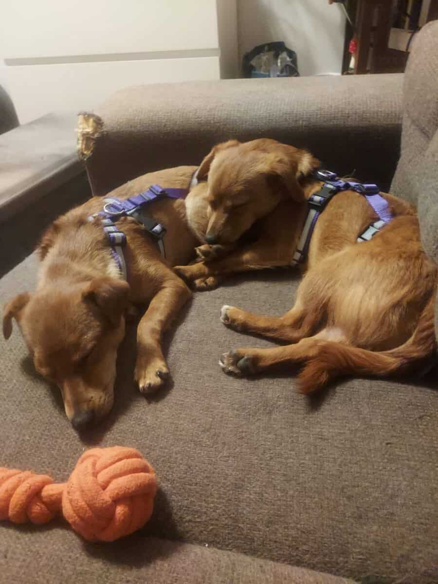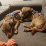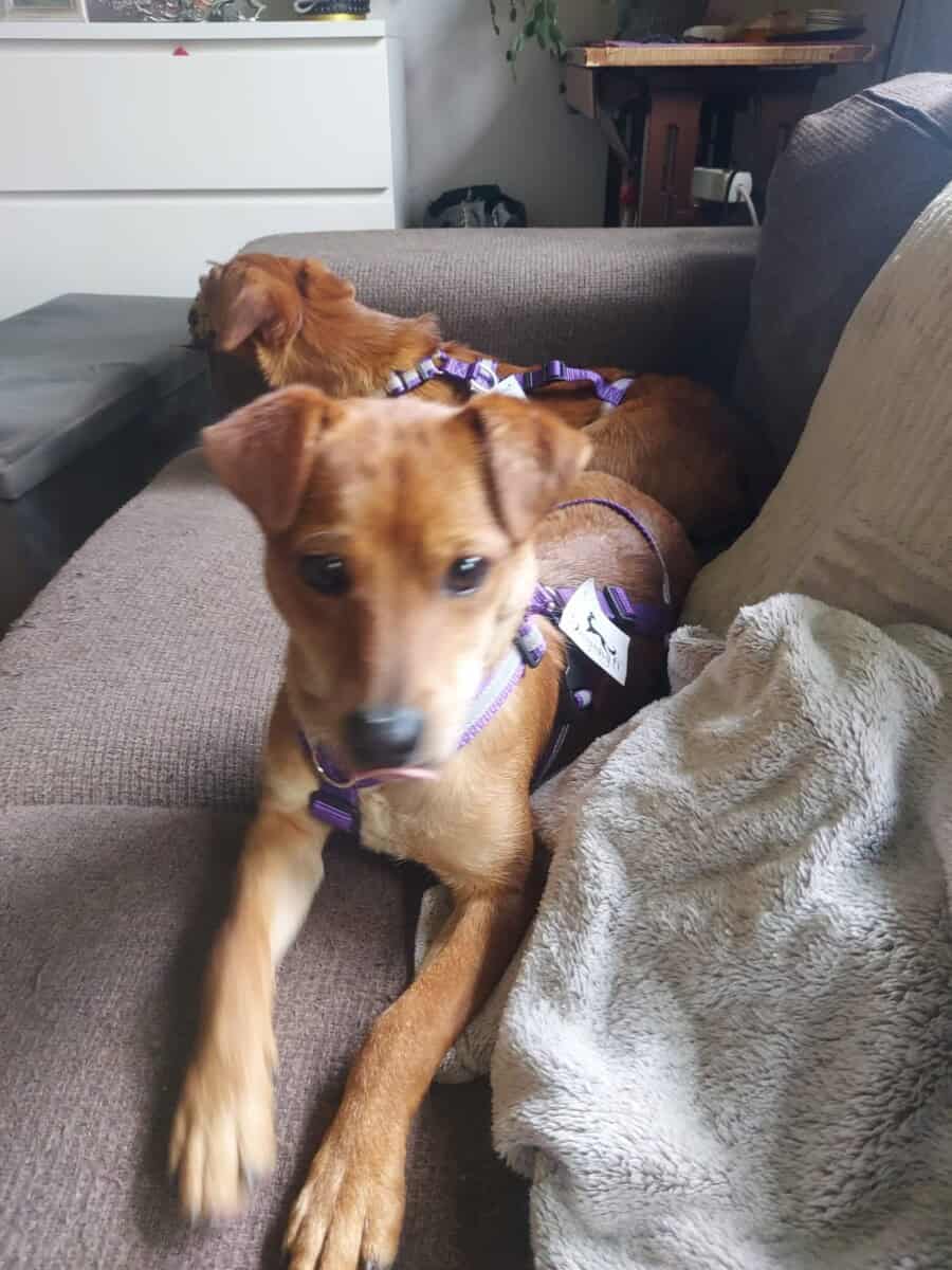 On aloitettava sillä, että me ollaan pentuja. Pennut tutkii elämää hampaillaan ja täällä kotihoidossa on tutustuttu esimerkiksi huonekasveihin, käsitöihin ja koiraporttiakin on tullut maisteltua. Meillä on täällä ihana isosisko, jonka kanssa saadaan riehua. Energiaa nimittäin riittää! Välillä painitaan vain kahdestaan, mutta välillä me liittoudutaan apusiskoa vastaan ja pannaan ärsyttäen. Riehumisen jälkeen virta loppuu pentumaiseen tapaan kuin katkaisijasta kääntämällä ja sitten me nukutaan kaikki sopuisasti läjässä Ei osata vielä kulkea hihnassa, mutta tarpeet osataan vääntää ulos.