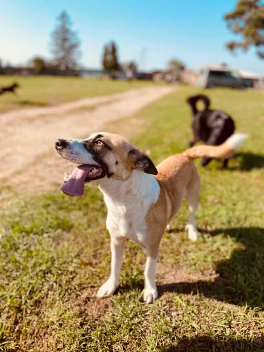 Ai miten niin viihtynyt? Miten turvoksiin ahdetulla koiratarhalla voi muka kukaan viihtyä? No, minä olen lähtökohtaisesti hyväntuulinen ja aika onnellinen koira. Asustelen täällä neljän muun koiran kanssa samassa aitauksessa ja tullaan pääosin hyvin juttuun. Välillä villi natiaisenergiani turhauttaa kämppiksiä. Hihnassa koirien kohtaaminen on perin outoa ja olen siinä vielä aika epävarma. Haukun muille koirille ja ihmisille kovasti. Hihnassa olen muutenkin vallaton, mutta se johtuu puhtaasti siitä, että olen lapsekkaalla energiallani vain ihan todella kiinnostunut ympärilläni olevista asioista. Vedän hihnassa vain, koska en malttaisi odottaa pääsyä nuuskuttelemaan uusia tutkimusmatkoja. Mihin ihmeen simulaatioon ihmiset meitä koiria meinaa mallailla? Tarhan työntekijät ovat sanoneet, että totun hihnassa kulkemiseen kyllä ja opin rauhoittumaan.