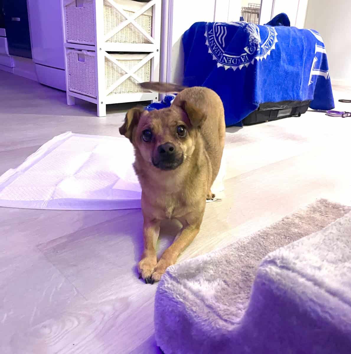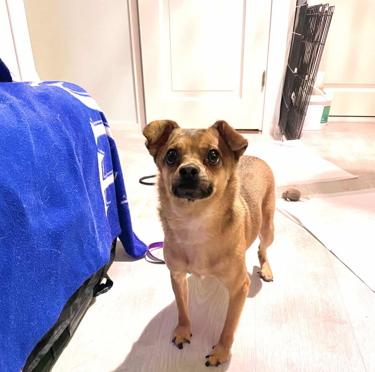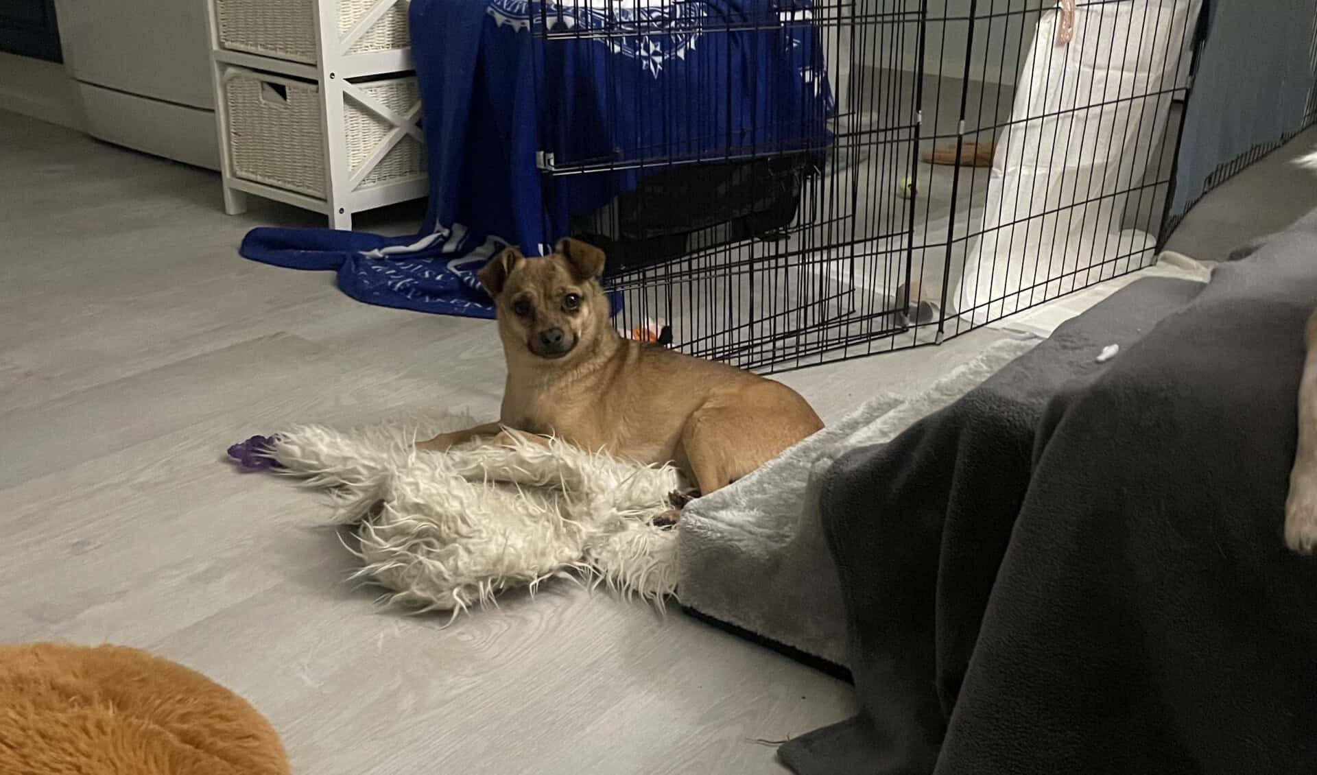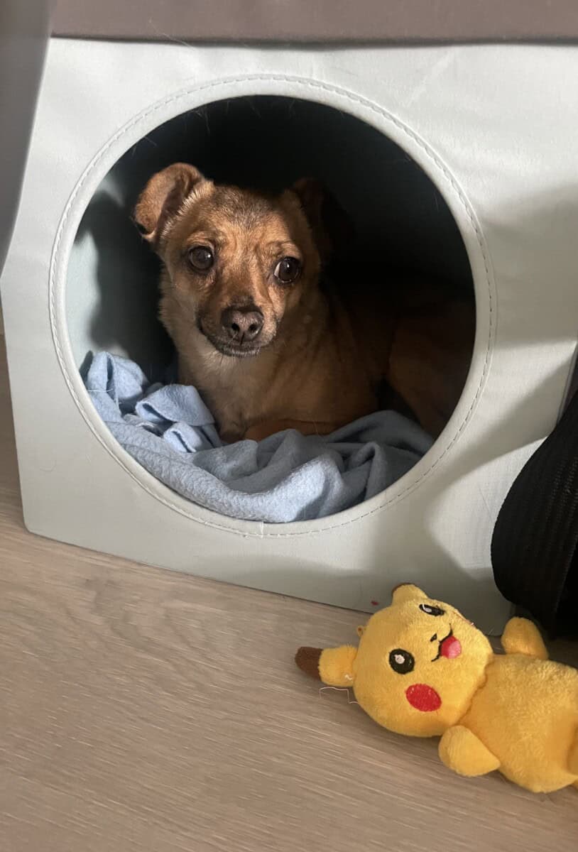 Olen nyt ollut täällä muutaman viikon ja olen oppinut pikkuhiljaa uusia asioita, kuten että saan ruokaa KAKSI kertaa päivässä! Olen niin innoissani, kun kuulen papanarasian aukeavan, että syöksyn häntä heiluen keittiön kulmille norkoilemaan. Annan myös kotihoitajani silittää minua, jos hän osaa olla oikein hidas liikkeissään. Nopeat äkkiliikkeet pelottavat minua. Osaan käydä aidatulla pihalla tarpeillani, vaikka vahinkoja toki tulee vielä sisällekin. Valjaat pelottavat minua kovasti, enkä siitä syystä ole vielä päässyt harjoittelemaan hihnassa ulkoilemista. Rakastan hoitajani kanssa leikkimistä, minusta on hurjan hauskaa jahdata käsiä ja oikein tärisen innostuksesta. Vien myös mieluusti leluja omaan turvapaikkaani. Perheen seniorin kanssa olen opetellut varovaisia painileikkejä.