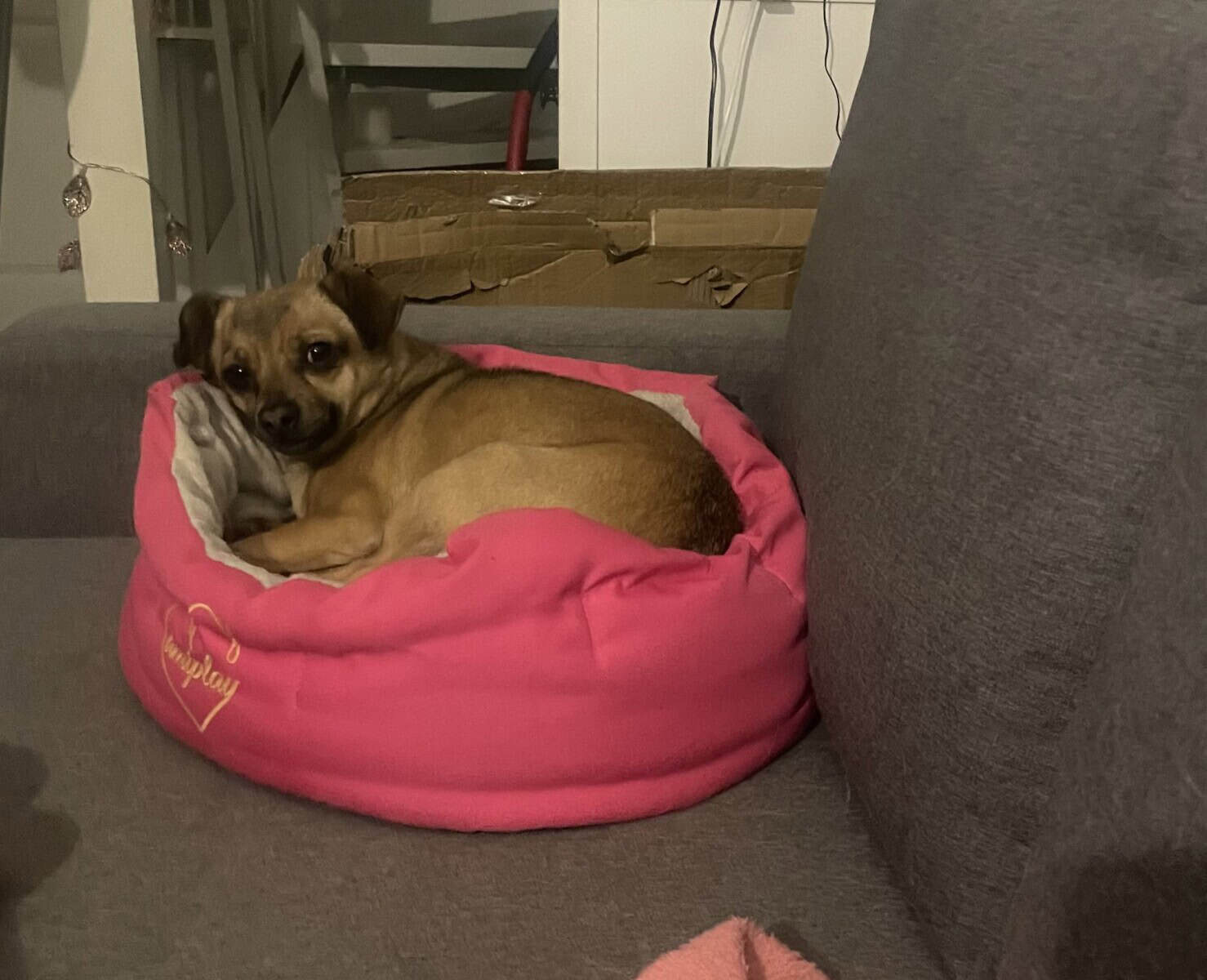 Kaverit ovat ihan parasta, ja kutsunkin jatkuvasti perheen muita koiria juoksu ja painileikkeihin. Tulenkin tarvitsemään kodin jossa on minulle koirakaveri. Osaan hienosti lukea muita koiria ja tulemme varsin mainiosti toimeen. Päivät vietän olohuoneen puolella arjen touhuja katsellen mutta yöt haluan aina viettää omassa pesäpaikassani kylpyhuoneen kaapissa. Olen iloinen ja hilpeä koira, kun luottamukseni vain ansaitsee. Kanssani edetään pikkuhiljaa, ja koska rajojani on kunnioitettu, ei minulla ole enää ollut tarvetta hammastella. Tulen hakemaan rapsutuksia hoitajaltani ja uskallan tulla viereen sohvalle nukkumaan.