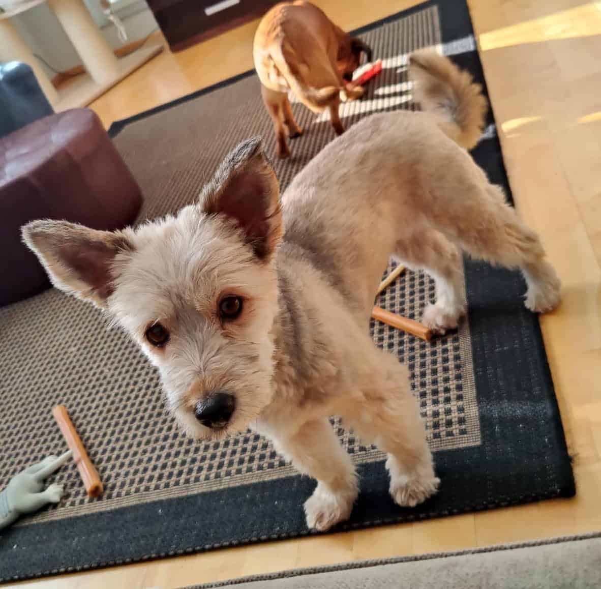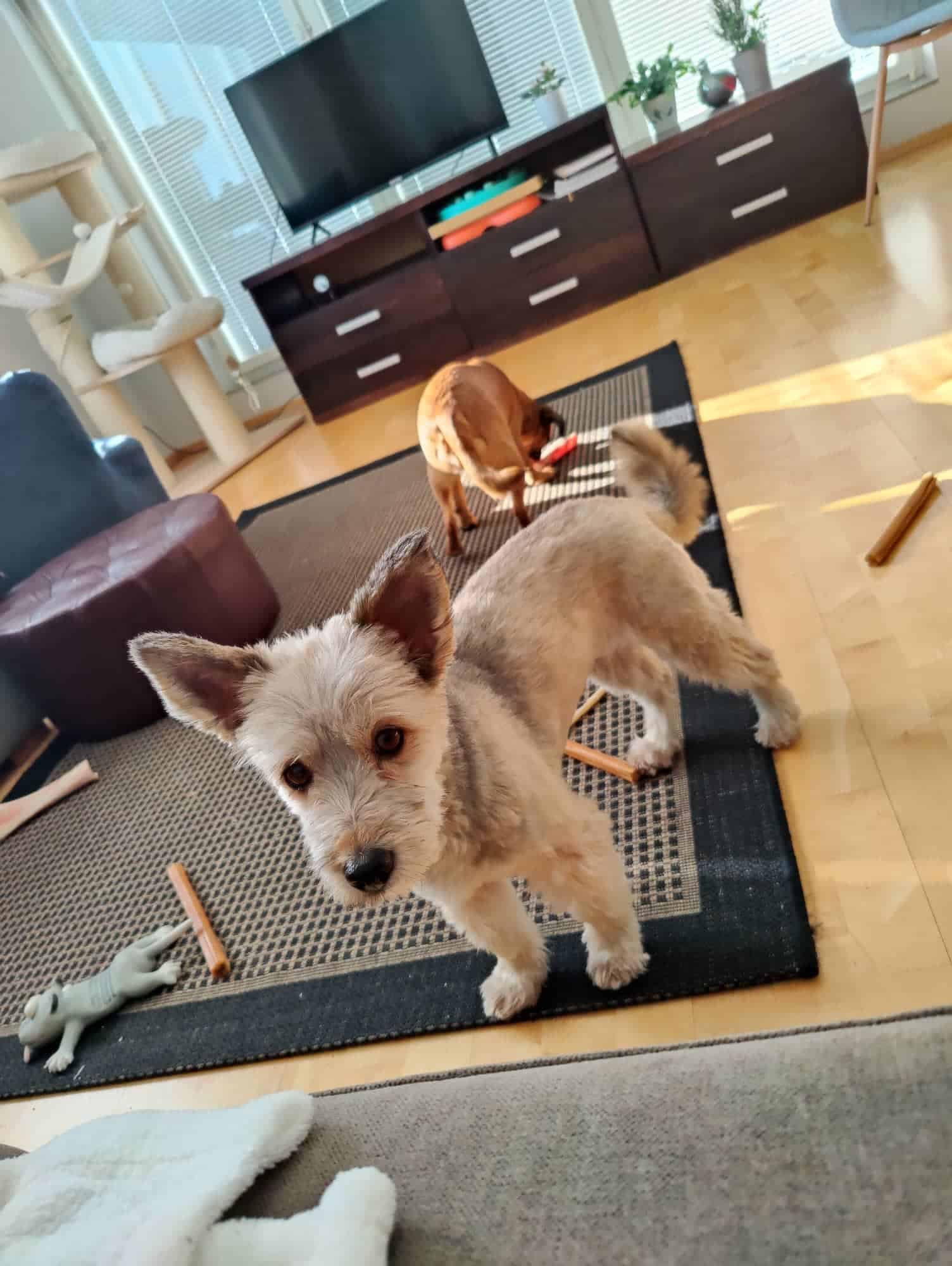 Reippaat lenkit ja ihmisten mukana touhuaminen ovat suosikkipuuhaamme. Täällä hoitokodissa meillä on kokonainen lauma koirakavereita ja kaikkien kanssa on tultu hienosti toimeen. Myös kissoja täällä on! Myönnetään tähän väliin, että minä olen hieman sellainen tapaus, että kiihkeässä menossa saatan purkaa jännitteitä Dasaan, mutta olen kyllä niissäkin tilanteissa kuunnellut ihmistä hienosti. Tarpeet on tehty ulos, ruoka maistuu ja uni tulee parhaiten pehmeällä pedillä.