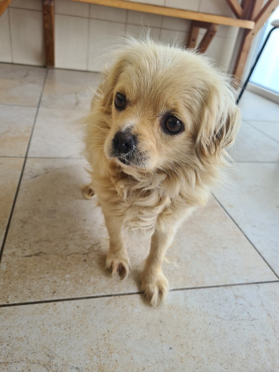 Hei vaan. Olen pikkuruinen Maze ja elämäni ei ole ollut helppoa. Minulla oli kyllä omistaja, joka kaikenlisäksi huolehti kyllä tavallaan koiristaan. Asuimme Pasvalyksen alueella peltojen keskellä maalaistalossa iäkkään omistajamme kanssa. Meitä oli 12 koiraa ja omistajamme ei kyennyt meistä kunnolla huolehtimaan. Mazas Draugaksen Anzelica toi meille ruokaa ja loishäätölääkkeitä, sillä olimme jatkuvasti niiden tarpeessa. Omistajamme syötti meille epämääräistä mössöä, muuta ei luultavasti ollut. Lisäksi olimme äärettömän arkoja kaikki.