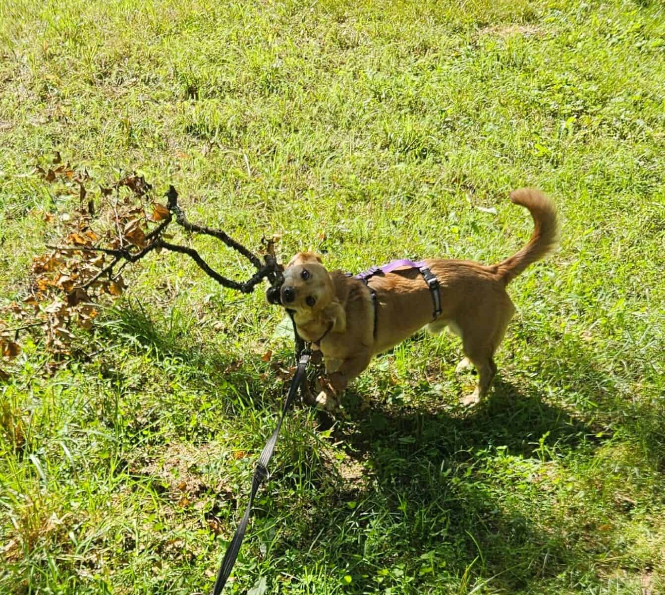 Muistatteko kun puhuin aikaisemmin siitä että napsin ulkoillessa maasta asioita? Olen oppinut sellaisen hassun tavan, että köpötellessäni nappaan keppejä mukaani mutusteltavaksi. Koolla ei ole väliä, olipa se sitten pikkuinen risu, taikka oksa isolla O:lla, se lähtee meikäläisen matkaan!