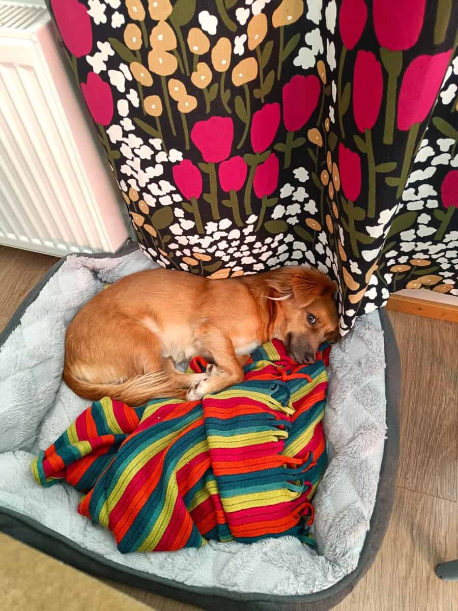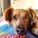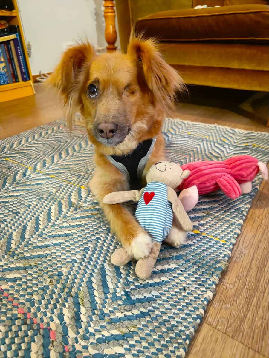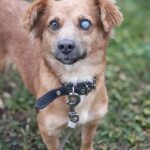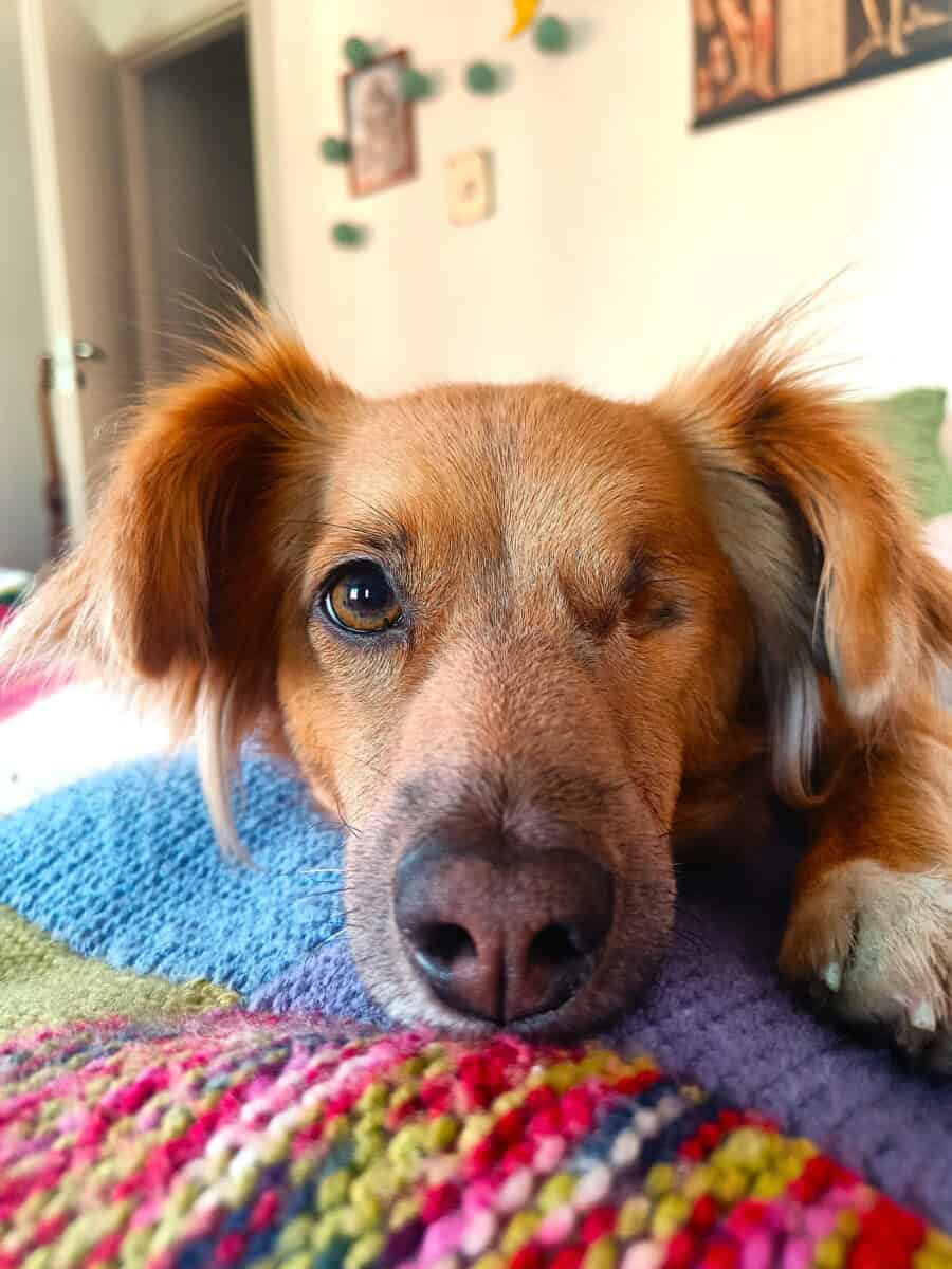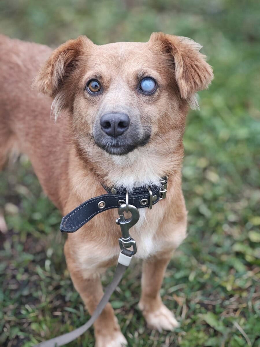 Kuten kuvasta näkyy, toinen silmäni on poistettu. Saapuessani Suomeen silmässäni oli rakkulainen haavauma, jonka vuoksi silmäni oli poistettava. Elän aivan tavallista kotikoiran elämään eikä yksisilmäisyys menoani haittaa.