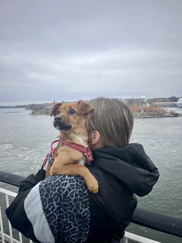 Minulla oli varsin jännittävä lokakuun viimeinen viikonloppu! Pääsin kotiutuvien koirien mukana Suomeen viikonlopuksi. Minä tyttö olin hyvin reipas ja matkustin autossa rennosti pötkötellen, aivan kuin olisi jokapäiväistä päästä tarhalta pois ja näin tärkeälle matkalle. Pysähdyimme jaloittelemaan meren rannalle ja katselin ihmeissäni pärskyviä laineita. Edes laivamatka ei hätkäyttänyt minua, vaan katselin kannella turvallisesti sylissä ohi lipuvia maisemia.