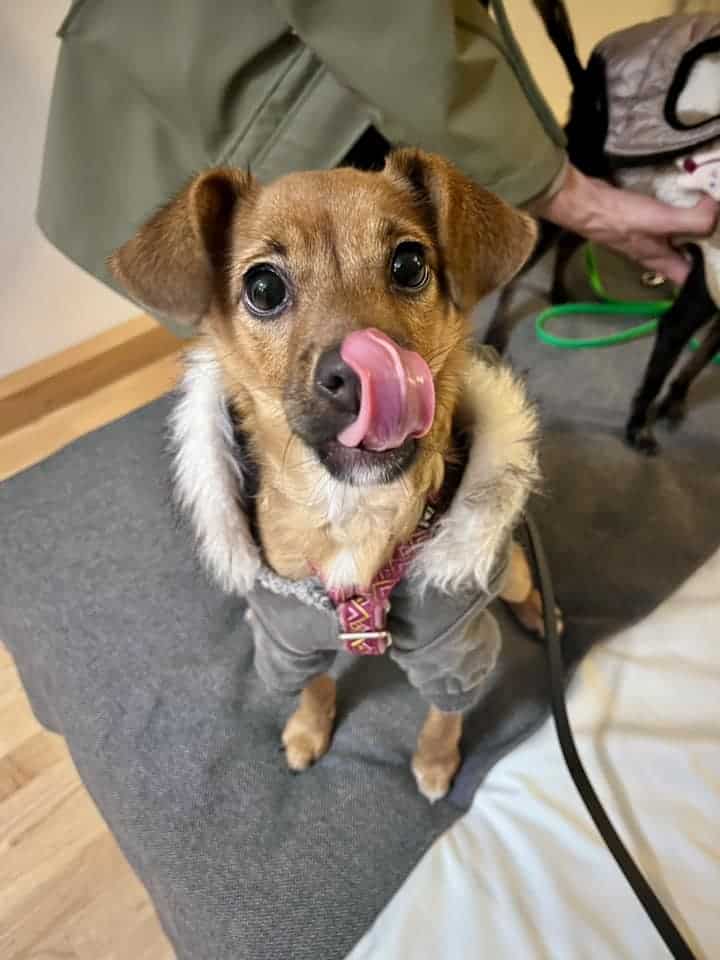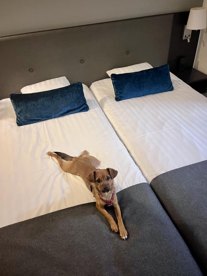 Voitteko kuvitella, että pääsin ihan oikeaan hotelliin yöksi! Minä otin ilon irti ja hyppäsin sänkyyn ehkä ensimmäistä kertaa elämässäni. Venyttäydyin oiiiiikein pitkäksi ja totesin, että tähän sitä voisi tottua! Seuraavana päivänä pääsin vielä oikeaan suomalaiseen koirapuistoon tapaamaan jo aiemmin kotiutuneita koiria. Tarhan työntekijät eivät välttyneet kyyneleiltä tavatessaan entisiä hoidokkejaan. Koko reissun ajan käyttäydyin mallikkaasti ja näkyy, että sopisin asumaan myös kaupunkiin. Oli kurjaa palata takaisin tarhalle näin mukavan reissun jälkeen. Heitänkin nyt kainon pyynnön, että saisin sen oman kotini Suomesta, missä koiran arvo on olla rakastettu perheenjäsen. Pääsisinkö Jouluksi kotiin? ♥