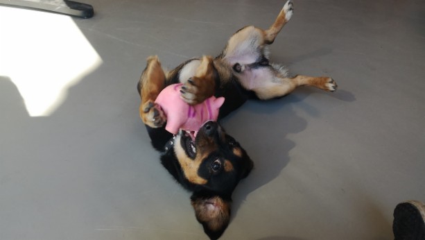 Olen aina hyvällä tuulella ja aina valmis leikkimään. Erityisesti pidän vinkuleluista. Ai niin, RAKASTAN ihmisiä ja lapsia.