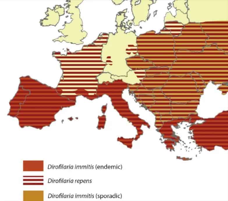 Ihomadon ja sydänmadon levinneisyys Euroopassa.